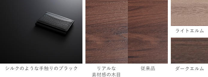 (右)リアルな素材感の木目:木目柄と同調させた凹凸の加工により、天然木のような見た目と手触りです。さらにメラミンならではの硬度と、低反射で指紋が目立ちにくい機能も備えています。