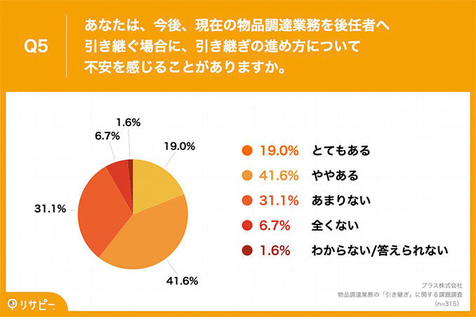 「Q5.あなたは、今後、現在の物品調達業務を後任者へ引き継ぐ場合に、引き継ぎの進め方について不安を感じることがありますか。」(n=315)と質問したところ、「とてもある」が19.0%、「ややある」が41.6%という回答となりました。