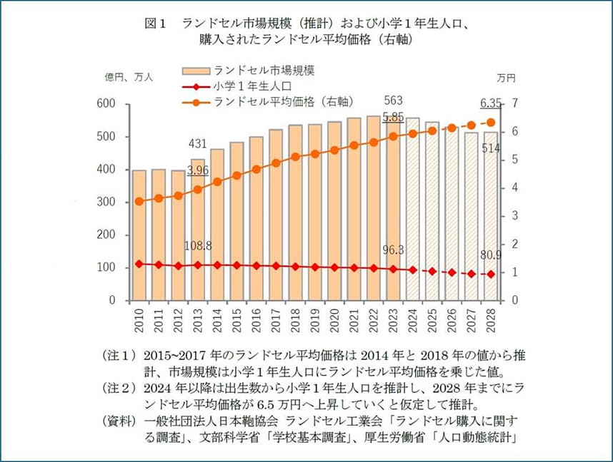 出典:ニッセイ基礎研究所レポート「少子化でも拡大、ランドセル市場-平均価格の上昇で市場規模は563億円へ」(2024年2月28日)
