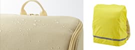 水にぬれても染み込みにくいはっ水加工を生地に施すとともに、雨風が強い日は付属のレインカバーを使用することで汚れや水ぬれの心配を減らします。レインカバー色は遠目から認識しやすいイエローを採用。