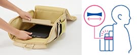 ■重い電子端末は仕切りを使って背面に収納! 重心を安定させる固定ベルト付き