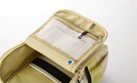 内側上部のA5サイズ相当のメッシュポケットは、中身が透けて見えるので、時間割などを入れるのに便利です。ポケット内には大切な鍵やGPSなどを取り付けられるフック(ナスカン)も付いています。