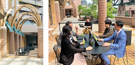 心地いい風が吹き抜けるこのテラスは、一人でも複数人での打ち合わせでも、さまざまな使い方で過ごせる自由さが魅力のスペース。職場の仲間との充実したワークタイムをご提供します。