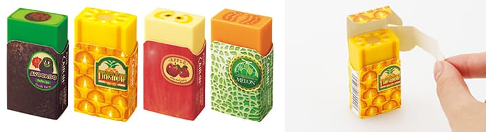 本製品は、リアルなフルーツを表現した消しゴムです。果物の皮に見立てた紙ケースを皮をむくように切り取ると、種や房までデザインされた本物そっくりな果実が顔を出します。開封したときの楽しさはもちろん、消していくことで本体がリアルな果物のように丸みを帯びていく、“消す”行為そのものが楽しくなる消しゴムです。