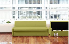一般的な収納付きソファ型ロビーチェアと比較して、座下収納を活用することにより、ストックできることが非常時への対応につながり、耐アルコール性による衛生面への配慮から、非常時のWhyで評価された。
