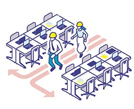 大切な情報を見えにくくするカモフラージュホルダーやキャビネットの飛び出しを未然に防ぐスタンダードデスク、ブレーキ機能付きのチェアなど、“いつも”安心を提供してくれる製品は、非常時にも確かな機能を発揮し、安全を確保してくれます。