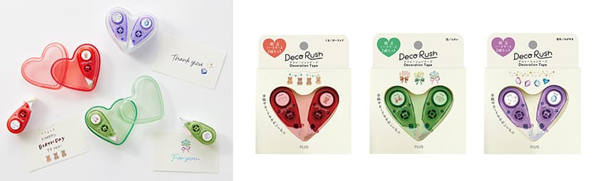 プラス株式会社(東京都港区 代表取締役社長 今泉忠久)は、かわいさと実用性を兼ね備えたデコレーションテープ「デコラッシュ」シリーズから、専用ハートケースと組み合わせて楽しめる2柄のデコラッシュをセットにした「デコラッシュ限定ハートケースセット」(3種)を2025年1月8日に発売します。