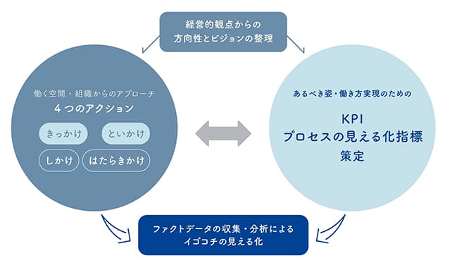 独自のフレームワーク「4つのアクション(きっかけ・といかけ・しかけ・はたらきかけ)」により、イゴコチのいいオフィスを実現するために必要なアクションを整理。社員が自発的に生み出すアクションから企業側に求められるアクションまで分かりやすく分類し、企業の目指す理想の姿と働き方実現のために必要な要素を見える化します。