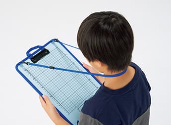 「安全パーツ付たんけんボード」は、小学校低学年を中心に、課外学習や生活科・理科・体育などの授業で使われる学習用のクリップボードで、本体の素材に発泡PPシートを採用することにより、軽量で水に強く、野外活動での使用に最適な仕様です。また、安全面にも配慮し、首や肩から下げて使用するストラップは、強く引っ張られると安全パーツのジョイント部分が外れる仕組みです。