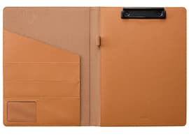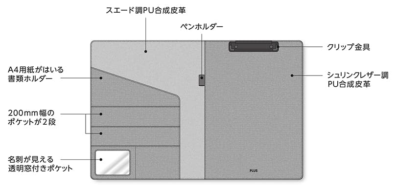 外側にはシュリンク調、内側にはスエード調のPU合成皮革を使用することで、1枚革の革小物のような重厚感を演出。上品で控え目なツヤと柔らかな質感が洗練されたイメージを漂わせます。厚みを抑えたスリムなシルエットながら、A4用紙が入るL字型ポケットや薄いA5ノートも入る幅広ポケットが2段、名刺サイズのポケット2つ、ペンホルダーを搭載し、ビジネスシーンの頼もしいパートナーとして活躍します。