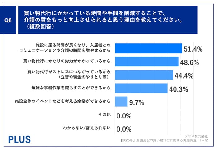Q7で「とてもそう思う」「ややそう思う」と回答した方にお聞きします。「Q8.買い物代行にかかっている時間や手間を削減することで、介護の質をもっと向上させられると思う理由を教えてください。(複数回答)」(n=72)と質問したところ、「施設に居る時間が長くなり、入居者とのコミュニケーションや介護の時間を増やせるから」が51.4%、「買い物代行にかなりの労力がかかっているから」が48.6%、「買い物代行がストレスにつながっているから(立替や現金のやりとり等)」が44.4%という回答となりました。