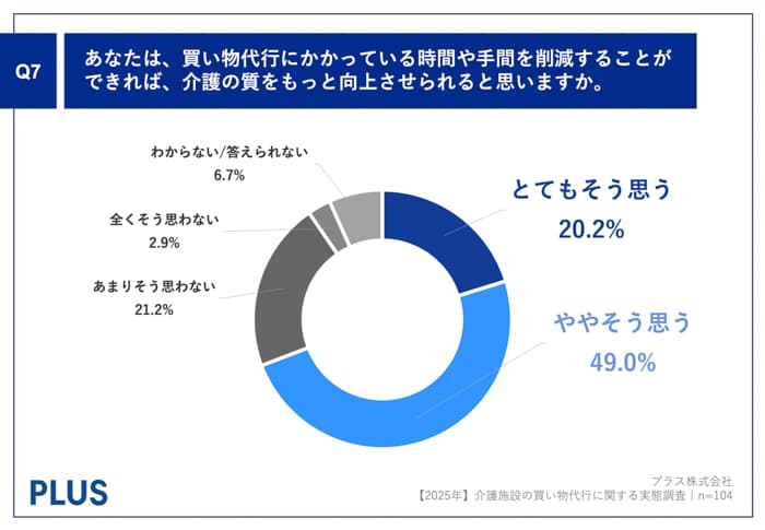 「Q7.あなたは、買い物代行にかかっている時間や手間を削減することができれば、介護の質をもっと向上させられると思いますか。」(n=104)と質問したところ、「とてもそう思う」が20.2%、「ややそう思う」が49.0%という回答となりました。