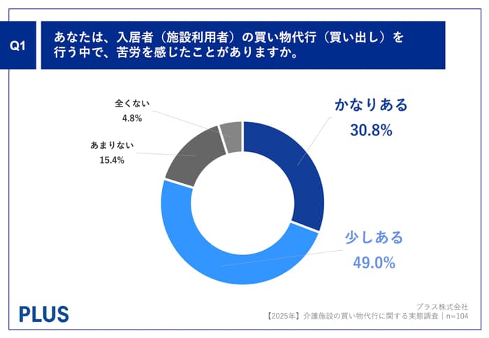 「Q1.あなたは、入居者(施設利用者)の買い物代行(買い出し)を行う中で、苦労を感じたことがありますか。」(n=104)と質問したところ、「かなりある」が30.8%、「少しある」が49.0%という回答となりました。