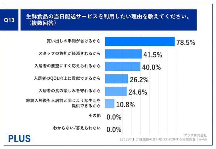Q12で「非常に利用したい」「やや利用したい」と回答した方に、「Q13.生鮮食品の当日配送サービスを利用したい理由を教えてください。(複数回答)」(n=65)と質問したところ、「買い出しの手間が省けるから」が78.5%、「スタッフの負担が軽減されるから」が41.5%、「入居者の要望にすぐ応えられるから」が40.0%という回答となりました。