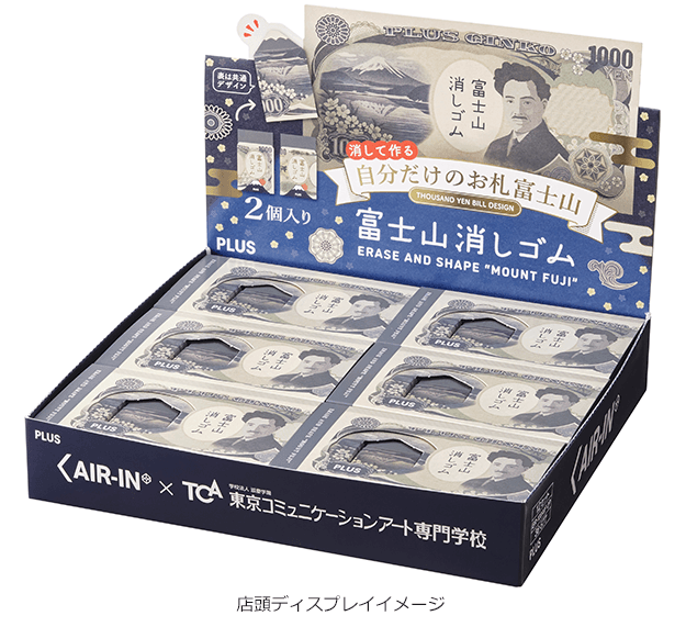 東京コミュニケーションアート専門学校とプラスとの初のコラボレーションが実現しました。50件以上の「富士山消しゴム」のアイデアの中から厳選。日本のお札をテーマにしたデザインが見事栄冠を手にし、製品化の運びとなりました。
