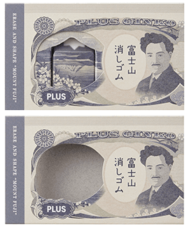 本製品は、東京コミュニケーションアート専門学校との共同企画から誕生。 “旧千円札”に描かれた富士山をテーマに、消しゴムを使っていくと富士山が徐々に姿を現し、お札のデザインが完成します。