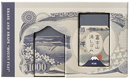 お札を模した小箱に、ケースデザイン違いの消しゴム2個を収めました。使った消しゴムを戻すと、富士山型の小窓から旧千円札の裏側の富士山の絵が完成する仕組みになっています。