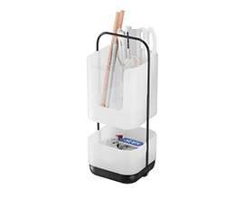 ペンスタンドとして利用する際は、2つのケースに分けてたっぷり収納することができます。筆記具や定規、はさみなどの長い道具を立てて入れる上部スタンド部分は仕切り付きで、仕分け・整理に便利。付箋や消しゴムなどは小物トレーにきれいに収まります。机上をすっきり整え、効率的な作業環境を実現します。