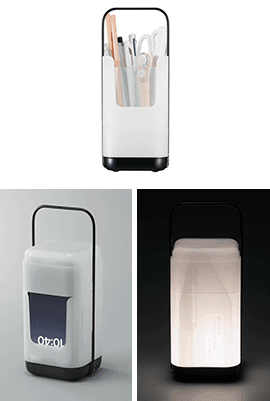 防災意識が高まるなか、本製品は普段使用しているものを非常時にも役立てる「フェーズフリー」の発想に基づき企画されました。日常時にはデスクワークを快適にする多収納型ペンスタンド。筆記具や定規、はさみなど長さのある道具に加え、付箋や消しゴムなどの小物類が入るトレーを備えています。スマートフォンスタンド機能も搭載し、机上をすっきり整理できます。さらに、停電や避難生活などの非常時には、スマートフォンや懐中電灯を入れることで光をやさしく拡散し、ランタンとして活用可能です。また、持ち手付きのため、フリーアドレスなどオフィス内での移動や、ランタンとして使う際にも明かりを運べるので便利です。