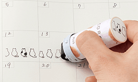 印面の柄は、ネコ好きの心をくすぐる4種類のデザインをラインアップ。5mm幅の「あしあと」と「けいと」の2種類は、非常に淡いインクカラーなので、両方の柄を組み合わせたり、アンダーラインとしてほんのり色付けを楽しむのにおすすめです。11mm幅は「かお」「うしろすがた」の2種類。いずれもシンプルなブラック色なので、上から色を塗ったり、デザインを書き加えることで、好きなネコに変身させることができます。