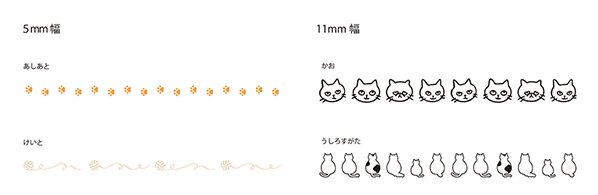 11mm幅には「かお」「うしろすがた」(いずれもインクカラー:ブラック)を展開。上から色を塗って自分の好きなネコにアレンジしてデコレーションが楽しめる遊び心あふれるデザインです。太幅なので、余白部分を彩るのにもおすすめです。
