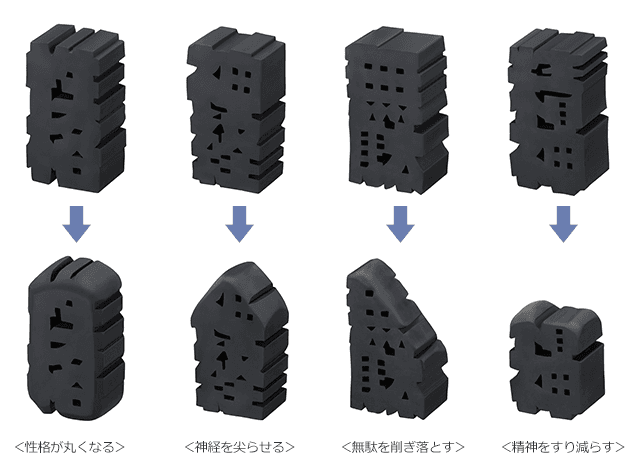 その流れの中で本製品は、文字そのものを造形モチーフとし、「性格が丸くなる」など慣用句が持つ感情や意味を“消しながら体感する”という視点で企画しました。雑貨クリエイター・もときれおが氏(デザインオフィスMONT、元プラス社員)のアイデアを基に共同企画し、4種類の製品化が実現しました。
