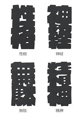 「性格」「神経」「無駄」「精神」の文字の凹凸や角の不規則な形状により、使うたびに消し心地や当たり方が変化します。密度が高く、崩れにくいデフォルメ文字は、削れ方によって印象が変わり、消し進める過程そのものを楽しめるデザインです。