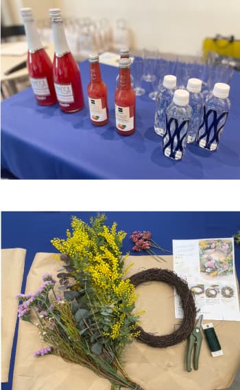 会場は、リースづくりで使用するミモザやスターチスが運び込まれ、目にも鮮やか!ここだけが一足早く春真っ盛りの様相で、ミモザのほかユーカリが優しく香っていました。