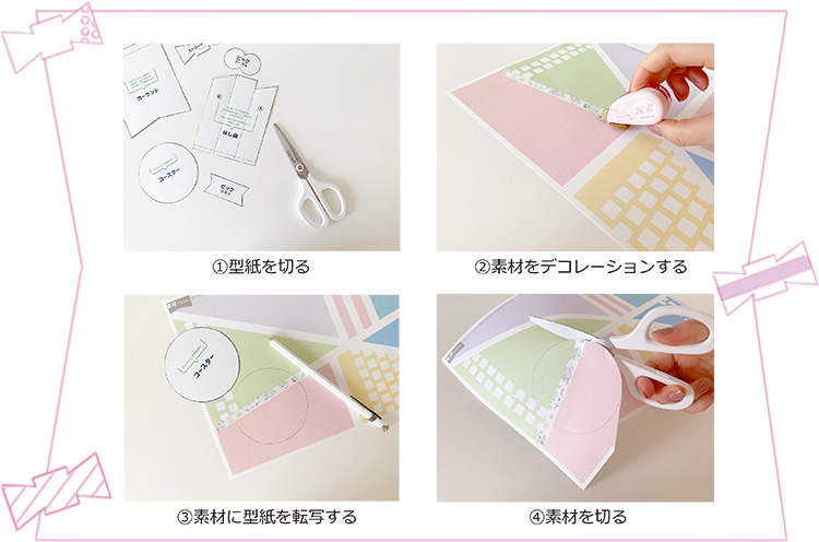 ②と③の手順は逆にしても!先にデコレーションした素材を切り抜くと、思いがけない柄が出る楽しさがあります。