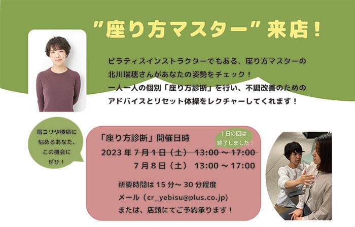 ※"座り方マスター"北川瑞穂氏の特別講座は7月1日(土)/8日(土)