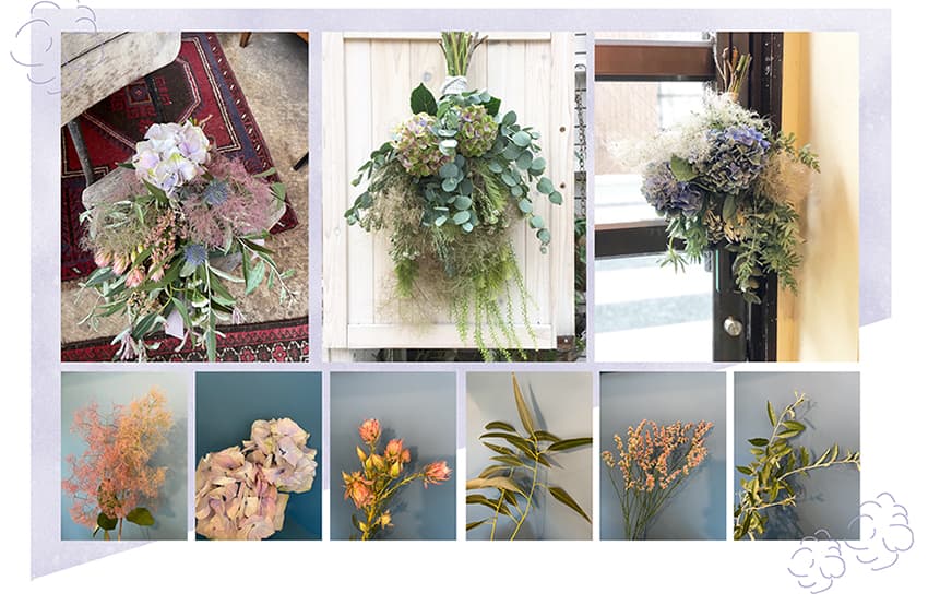 今回のワークショップでは、紫陽花とスモークツリーをメインに、ご自由に数種類の花材を選んで束ね、スワッグを作ります。たくさんの種類の中から好きな花材を選んでいただけるので、迷ってしまいそうですが、そんな時間も楽しみながらオリジナルの組み合わせであなただけのスワッグを、ぜひ作ってみてください♪