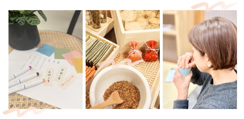 ご自身が心地良いと感じ、リラックスできる和の香りを聞きながら、自らが調香して、匂い袋としてお持ち帰りいただきます。