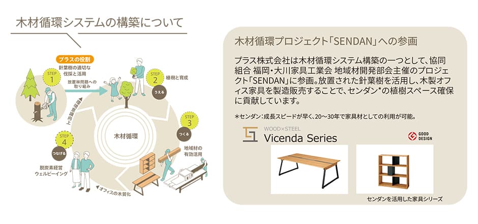 また、2018年からセンダンの植樹活動を始めており、消費者、住宅メーカー、工務店、家具メーカー、森林組合・自治体が共同で植樹することで、センダンを積極的に活用し、持続可能なサイクルを構築することを目指しています。
