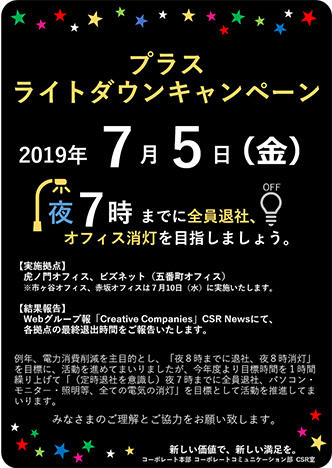 7月5日(金)、10日(水)、都内の虎ノ門・赤坂・市ヶ谷・五番町各オフィスにて、プラスグループCSR活動として「プラス ライトダウンキャンペーン」を実施しました。