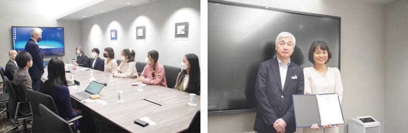 2013年にプラスが青山学院大学との提携により創設した、ベトナムからの留学生を支援する『PLUS・AGUベトナムスカラーシップ』。2022年度は、ハノイ国家大学外国語大学から3名、ホーチミン市人文社会科学大学から1名、計4名の奨学生を決定し、2023年2月2日(木)、昨年12月に東京・恵比寿に開設した新オフィス「PLUS DESIGN CROSS」にて奨学金授与式を行いました。