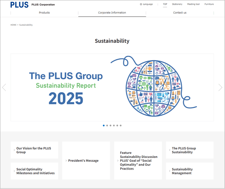 2025年9月16日、プラス株式会社は、プラスグローバルサイトにて「プラスグループ サステナビリティレポート2025」の英語版を発行しました。同時にサステナビリティページも本年7月に公開した日本語版に合わせて更新しました。