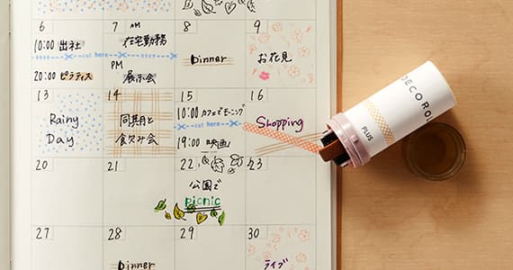 かわいさと実用性を兼ね備えたデコレーションテープ「デコラッシュ」シリーズから、「To Do List」「EVENTS」など、手帳や日記に記録したいテーマのタイトル文字をデザインした「デコラッシュ」<限定>Topic柄(7種類)を発売します。