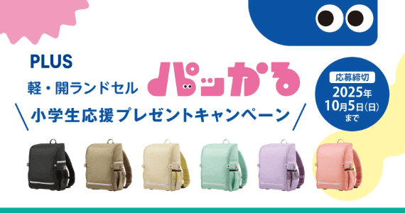 キャンペーン期間中に「軽・開ランドセル パッかる」をご購入、ご応募いただいた方の中から抽選で、30名様に「小学生お役立ち文具セット 」をプレゼントいたします。 2025年10月5日(日)まで。